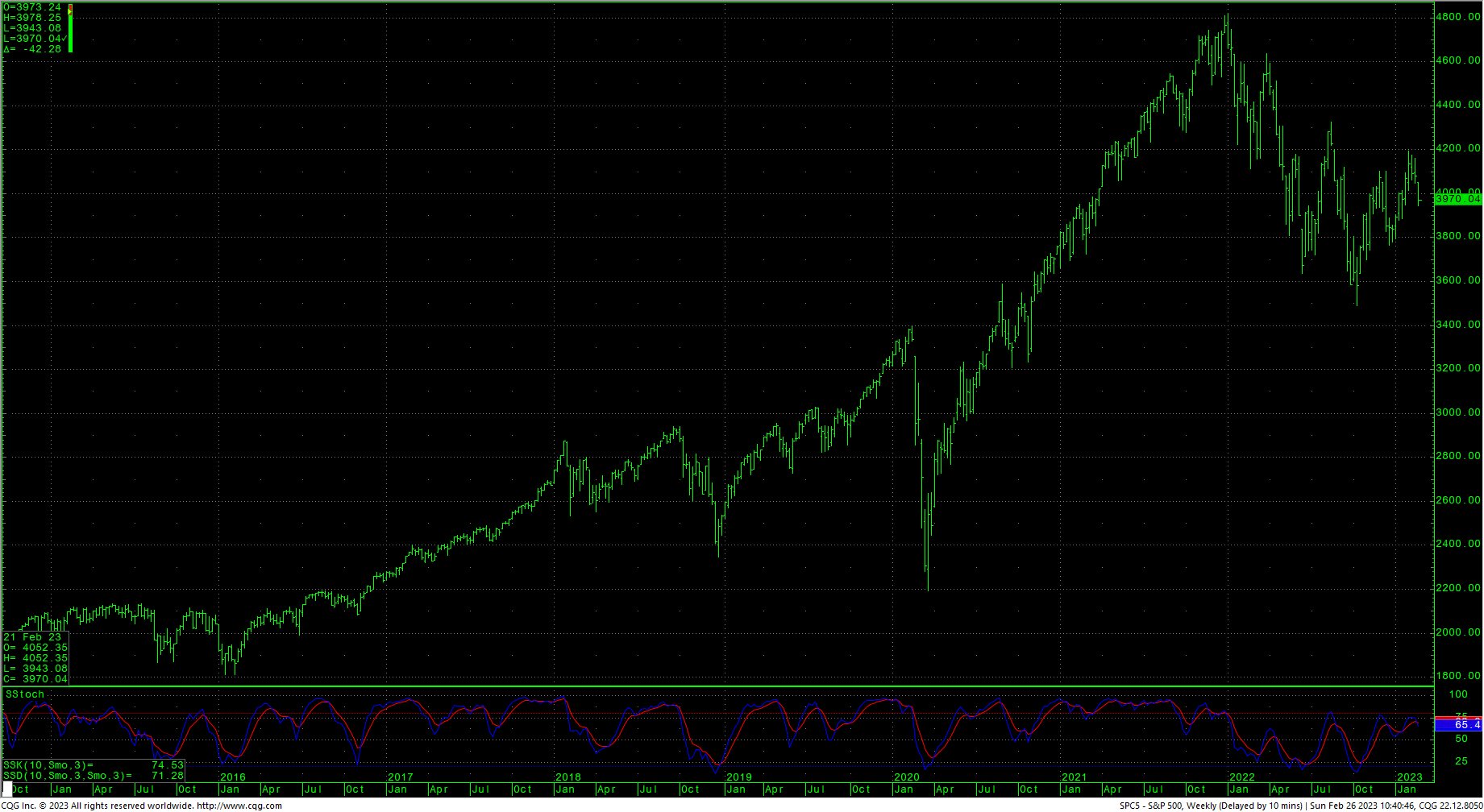 The DJIA opened lower, in a shortened trading week, and never looked back…with prices plunging -2.98% and ending on the bottom of the week’s range at the lowest weekly close since the end of October 2022. On the daily chart, the close is the lowest since December 20, 2022. Overall, the market is now trading the lower 50% of the range that has existed since November 2022, whereby we now have three months of trade basically contained within that month’s H/L. The Dow is down -3.72% on the month with two trading days left in February. The S&P500 followed the Dow with a lower opening on the week and a daily collapse to close on the bottom of the weekly range, down -3.09%. The bearish action shed some of the Bullish/Greed sentiment from investor surveys, leaving the 52-week net new highs and lows at +2.06% (which is still frothy).