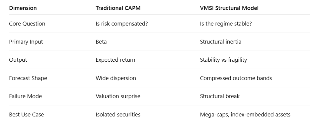 Where CAPM evaluates expected return relative to market risk, VMSI evaluates whether accumulated force is sufficient to overcome structural inertia.