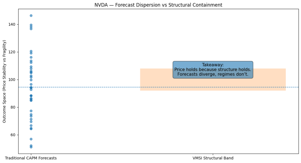 Traditional CAPM-based forecasts exhibit wide dispersion in implied forward outcomes for a mega-cap, index-embedded stock. VMSI models structural containment, producing compressed outcome bands that explain why prices remain anchored despite disagreement.