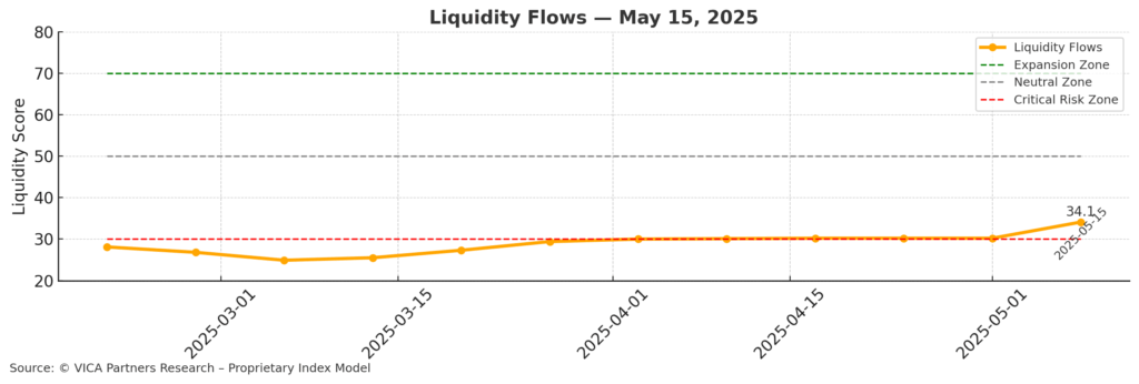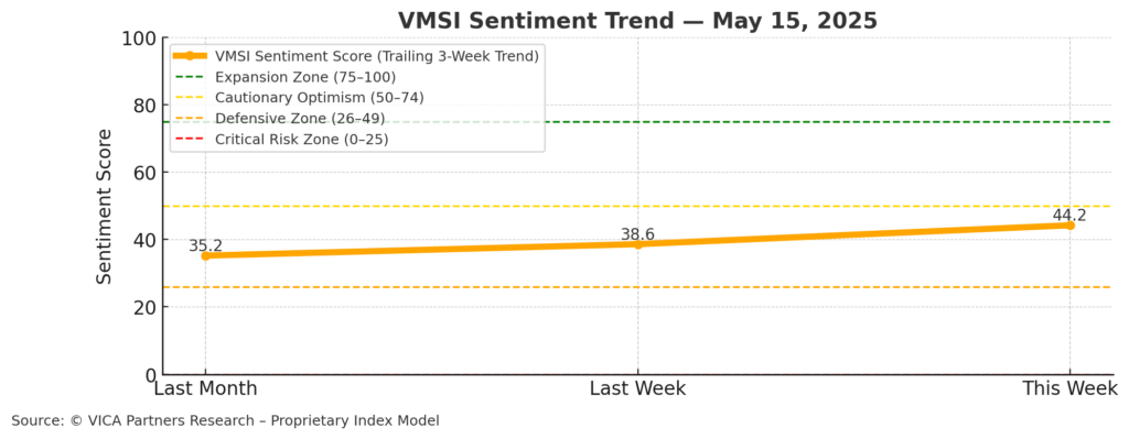 The VMSI is VICA Research’s proprietary sentiment gauge designed to track shifts in institutional risk behavior, capital flow posture, and macro-driven volatility signals.