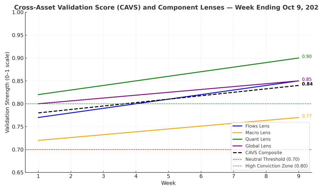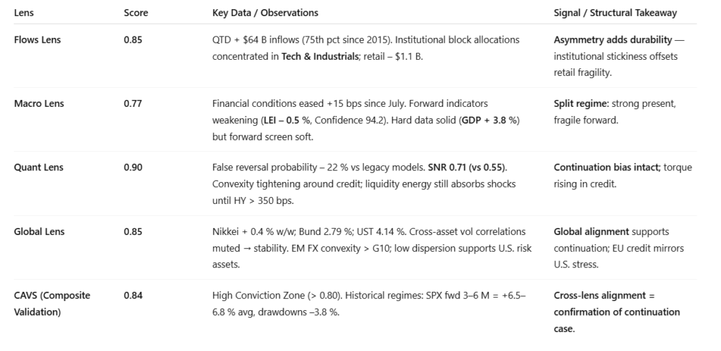 Allocator Note: With CAVS > 0.80, exposures can still be scaled, but discipline matters. Position sizing should favor institutional flows and quality credit, not momentum-chasing. Use overlays to hedge HY stress.