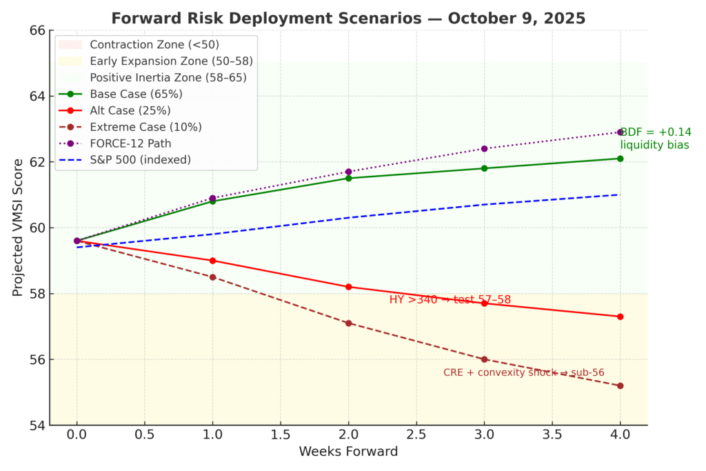Base Case (65 %) — Liquidity-Led Continuation: FORCE-12 trajectory = 59.6 → 60.8 → 61.5 (4 wks). Liquidity and execution capacity offset credit torque; historical analogs imply +4 – 6 % S&P follow-through. Alt Case (25 %) — Credit Bleed / Not Break: HY 340–350 bps; breadth < 60 %; CPI > 3.3 %; VMSI 57–58 zone. Extreme Case (10 %) — Convexity Event: HY > 365 bps; CRE stress + VIX > 24. VMSI < 56 = fracture. BDF (+0.13) = positive bias → S&P +5–6 % 3 M historical return.