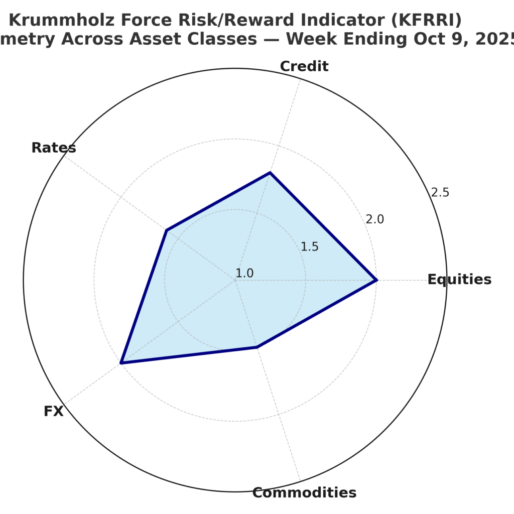 The Krummholz Force Risk/Reward Indicator (KFRRI) continues to flag structural asymmetry, but the rotation of convexity is accelerating. Liquidity still underwrites convex payoffs across asset classes, yet the distribution of risk/reward is no longer even — it is tilting more clearly toward quality credit and cyclicals, while HY spreads define fragility.