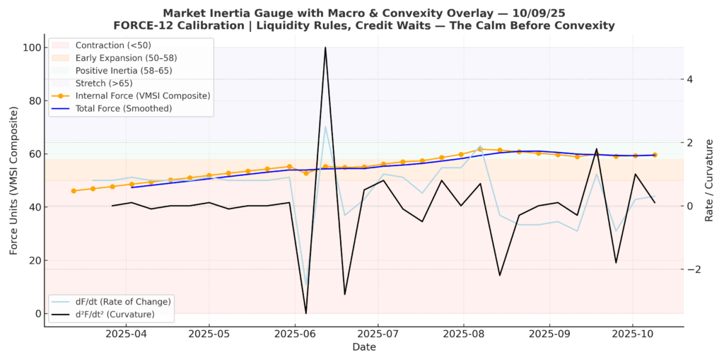 Structural Takeaway: Liquidity continues to define equilibrium, but credit torque is tightening. FORCE-12 calibration confirms that persistence remains intact (Mt = 0.9013 → VMSI = 59.6); continuation holds until high-yield spreads surpass the 340 bps threshold — the point where liquidity ceases to absorb and convexity takes control.