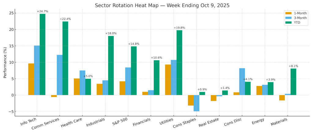 Signal: Growth + cyclicals (Tech, Comms, Industrials, Financials) continue to dominate rotational torque; defensives lag as liquidity favors velocity over ballast.