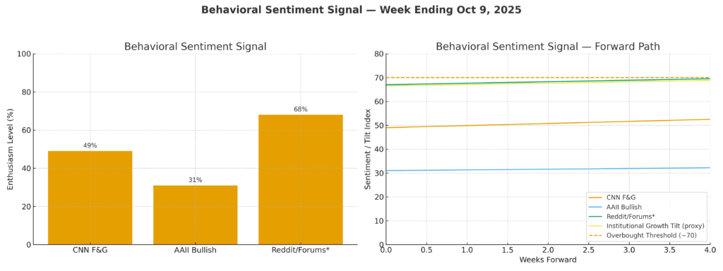 Institutions: +$7.1 B inflows (w/w) — allocations concentrated in Tech, Industrials, and IG credit ETFs; rotation from passive to active risk evident. Retail: –$0.9 B outflows — continued redemption cycle; retail remains volatility-sensitive, re-engaging only after multi-week index confirmation. Surveys: AAII bulls 30 % vs 29 % prior; neutral cohort rises to 40 %. CNN Fear & Greed Index: 56 (neutral → greed) ↑ from 53. IRSR: 1.6× — sustained institutional tilt consistent with VMSI > 58 regimes. Derivatives: Put/Call 1.02 ↓ from 1.08 — hedge unwinds underway. Positioning: Active manager net beta 0.65 (3-mo high); gross exposure +2.3 % w/w.
