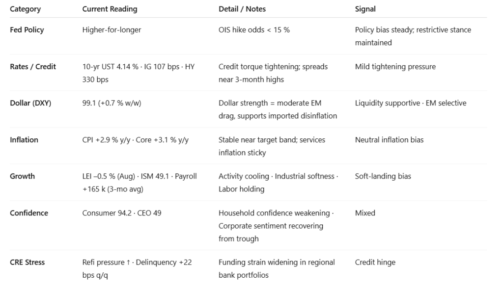 Macro context: Leading indicators continued to soften (LEI –0.5 in August), while consumer confidence held at 94.2 and CEO confidence improved to 49 (Q3). Core inflation stayed steady (+3.1 % y/y; headline +2.9 %), affirming the Fed’s “higher for longer” stance. Manufacturing and employment indicators remain mixed, suggesting digestion rather than deterioration.