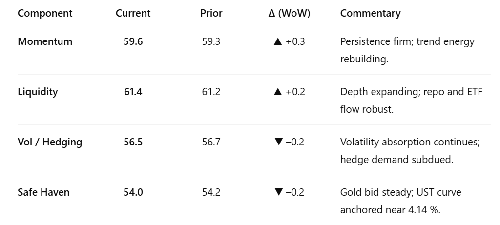 The VMSI composite index climbed to 59.6 from 59.3, extending its hold above the continuation threshold of 58. Liquidity depth and execution capacity remain the foundation of resilience, even as torque begins to migrate toward credit. Volatility remains compressed and pullbacks still absorb, but fractures in breadth and credit spreads are widening beneath the surface.