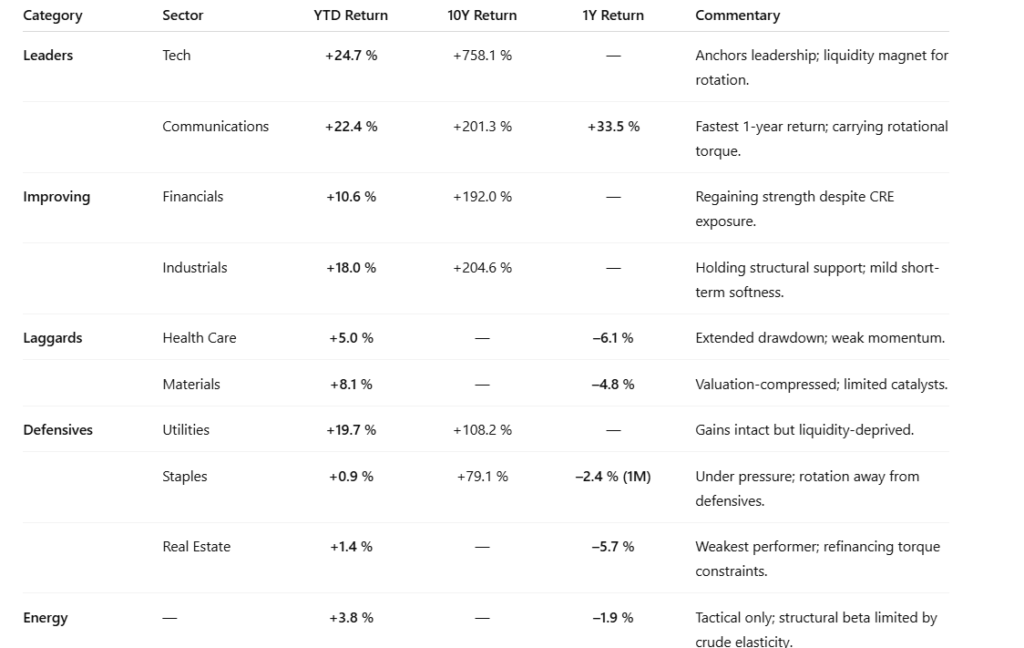 Allocator Note: Overweight growth / cyclicals; underweight defensives. Maintain beta discipline but ride liquidity-led continuation until breadth or credit breach occurs.