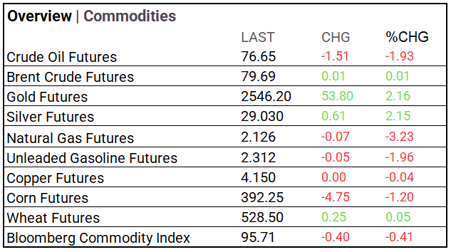 - Yields & Commodities: Yields fell across most maturities, with short-term notes seeing the largest declines, particularly the 3-Year Note. Commodities were mostly lower, except gold, silver, and wheat. Gold futures rose 2.16% to $2,546.20, leading to gains.