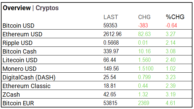 - Crypto & ETFs: Bitcoin settles at $59,353. And Ethereum went up $82.63 to $2612.96. ETF’s 2x Bitcoin Strategy ETF rose 9.76% on 6.3M volume.
