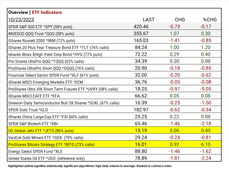 - Insider Insight: Options market bet heavily on Bitcoin Strategy ETF ^BITO to gain, and US Global Jets ETF ^JETS to fail.