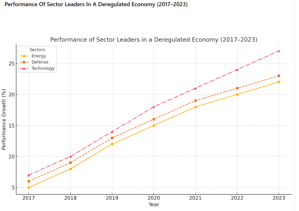 This chart illustrates how deregulation has been a transformative economic catalyst, driving significant growth in key sectors such as energy, finance, and manufacturing from 2013 to 2023. By reducing compliance burdens, energy production accelerated, financial capital flows expanded, and manufacturing investments in automation and efficiency surged. It underscores the direct correlation between regulatory rollbacks and sector performance, revealing opportunities for businesses to capitalize on reduced barriers and realign strategies for maximum growth potential.