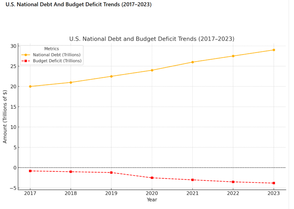 This chart highlights the steady rise in national debt and the widening budget deficit from 2017 to 2023, driven by increased spending on defense, infrastructure, and stimulus measures. While these investments support economic growth, they underscore the growing tension between short-term policy gains and long-term fiscal sustainability, emphasizing the need for disciplined financial management and strategic investment to mitigate potential economic risks.