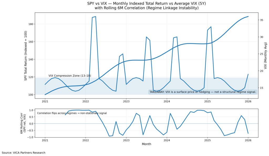 The chart does not argue that volatility is irrelevant. It argues that volatility is incomplete. The top panel shows that equity markets can advance materially through periods where implied volatility remains suppressed, and that volatility can rise sharply during repricing windows without serving as a reliable early warning signal. The bottom panel makes the deeper point: the relationship between equity outcomes and volatility pricing is unstable across time.